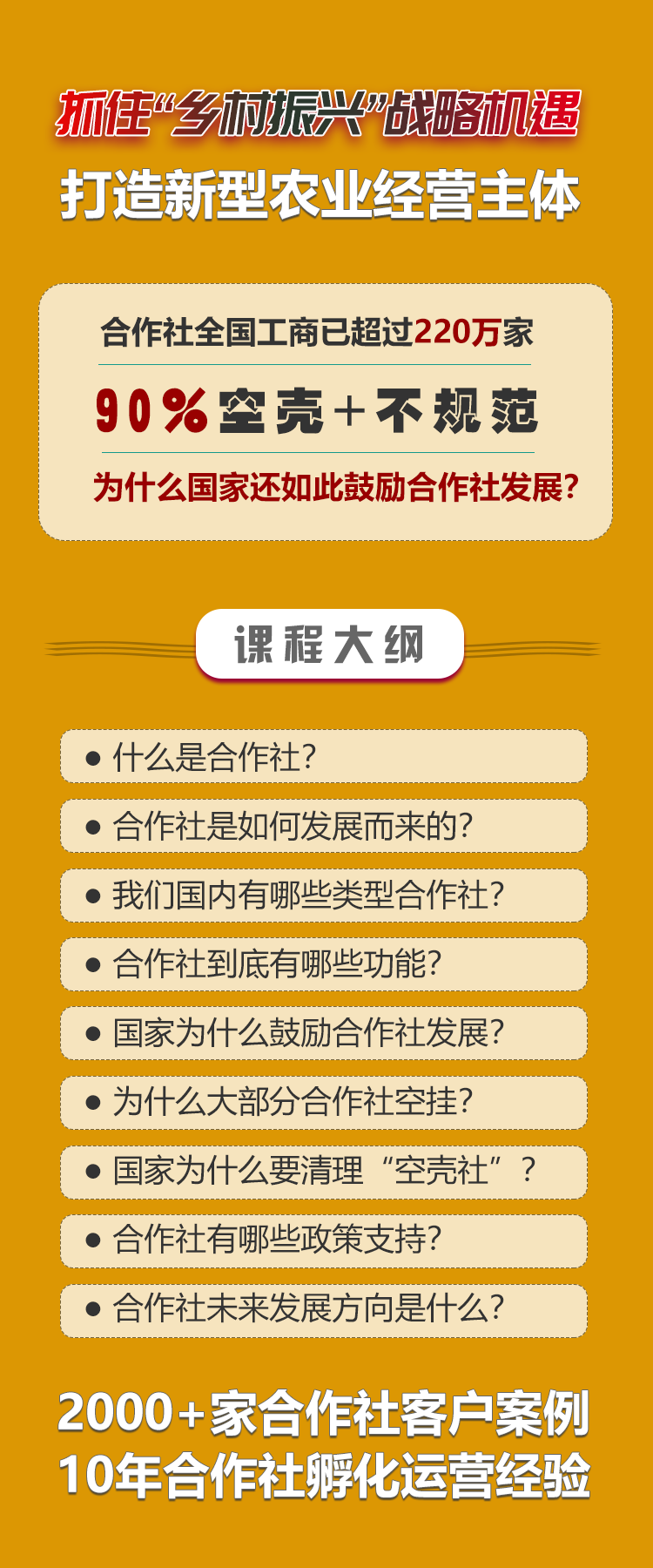 本课程是好集云农团队通过近10年积累,成功服务了全国20个省份2000+合作社主体,形成六大解决方案,重点帮助合作社等涉农主体解决土地流通成本和资金问题,助力涉农主体转型升级。希望本课程能给您思路和方向上带来一些改变…